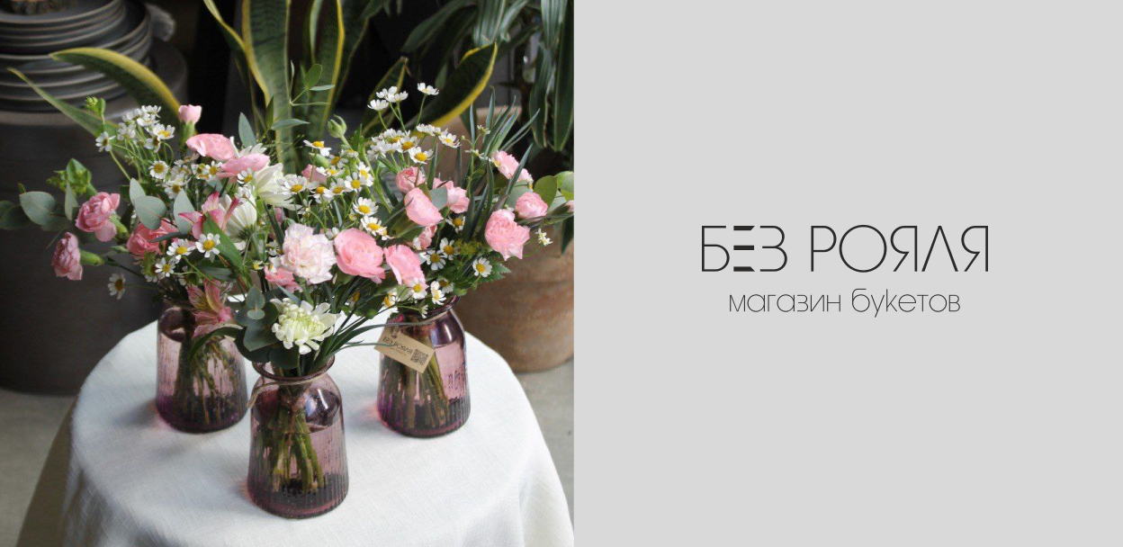 БЕЗ РОЯЛЯ — магазин букетов и декора с винтажной эстетикой. В работах БЕЗ РОЯЛЯ — акцент на многообразии форм и фактуры цветов, поэтому на витрине редко можно увидеть классические розы и хризантемы.
